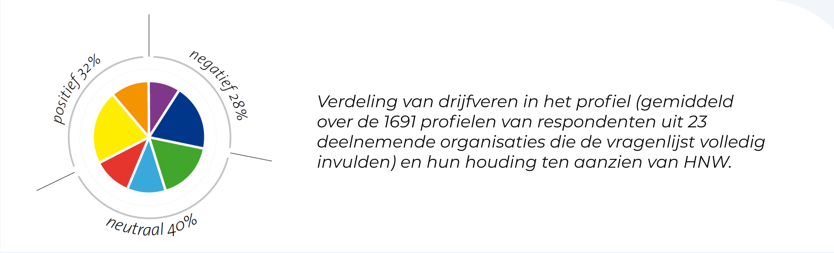 De gemiddelde score op de paarse en blauwe drijfveren was 28% van het totaal. Mensen met een voorkeur voor deze drijfveren zijn negatief over HNW en maken minder of nauwelijks gebruik van HNW-faciliteiten.